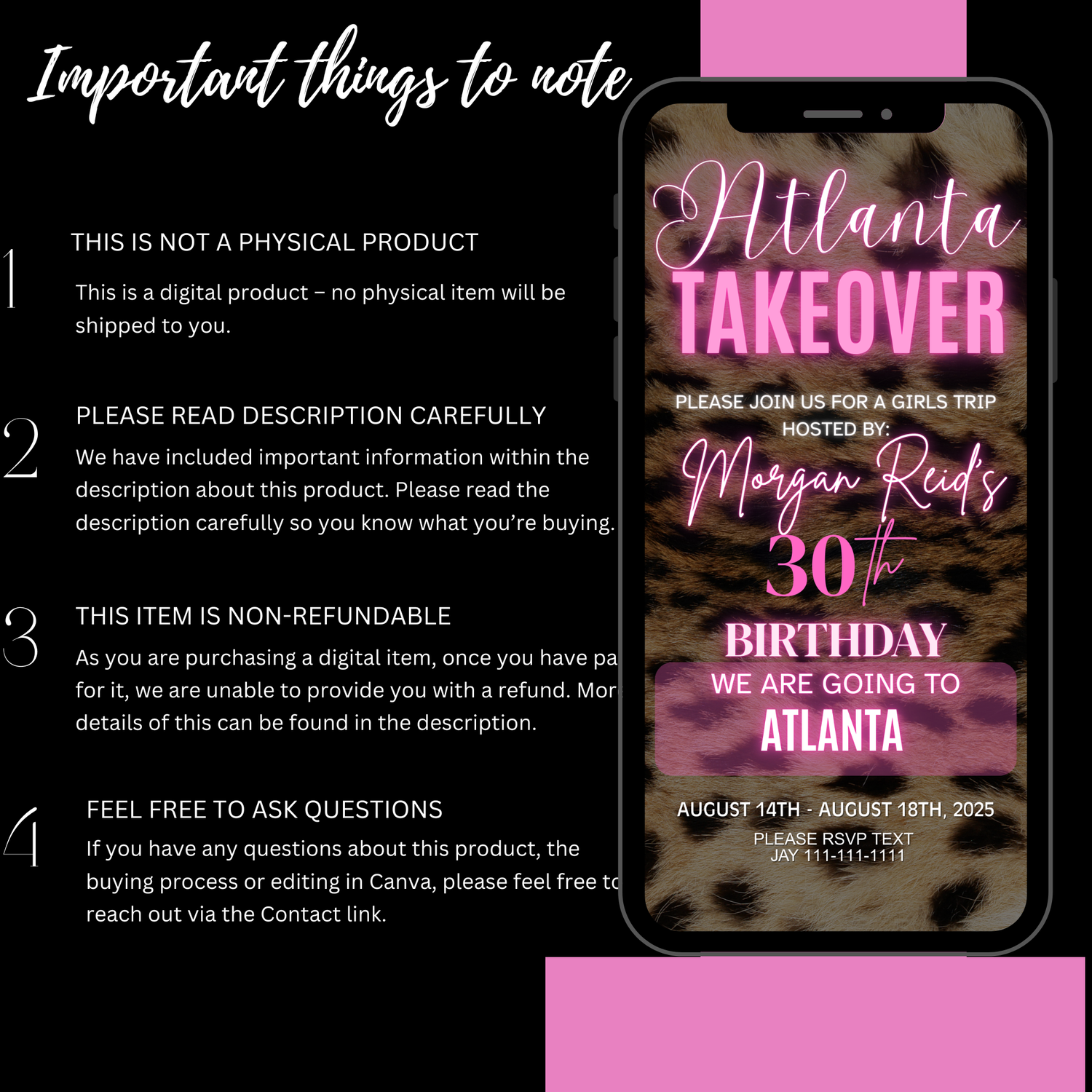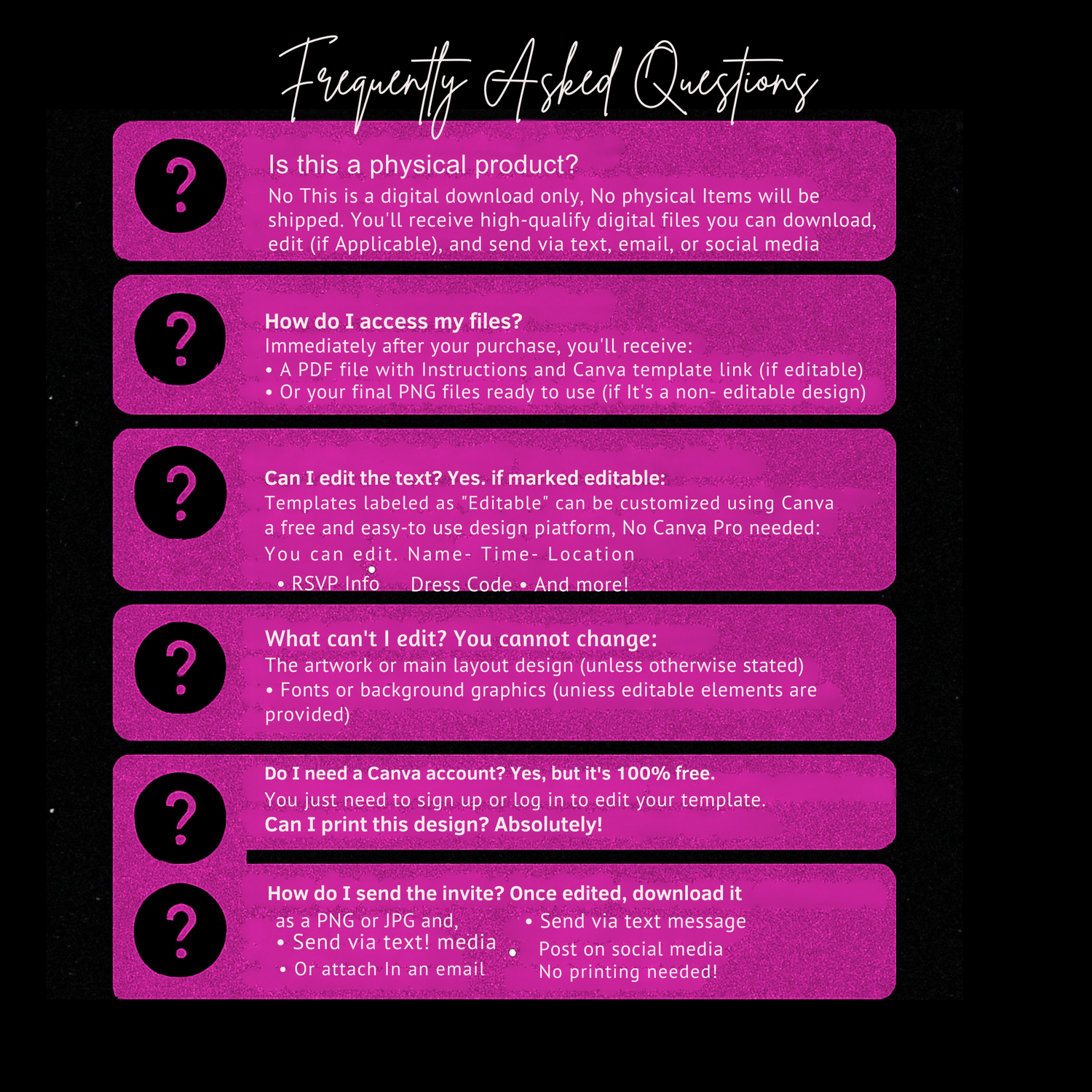 You will receive a Canva template that you can edit yourself using a FREE Canva account. Which you will then downlaod and send to guest.