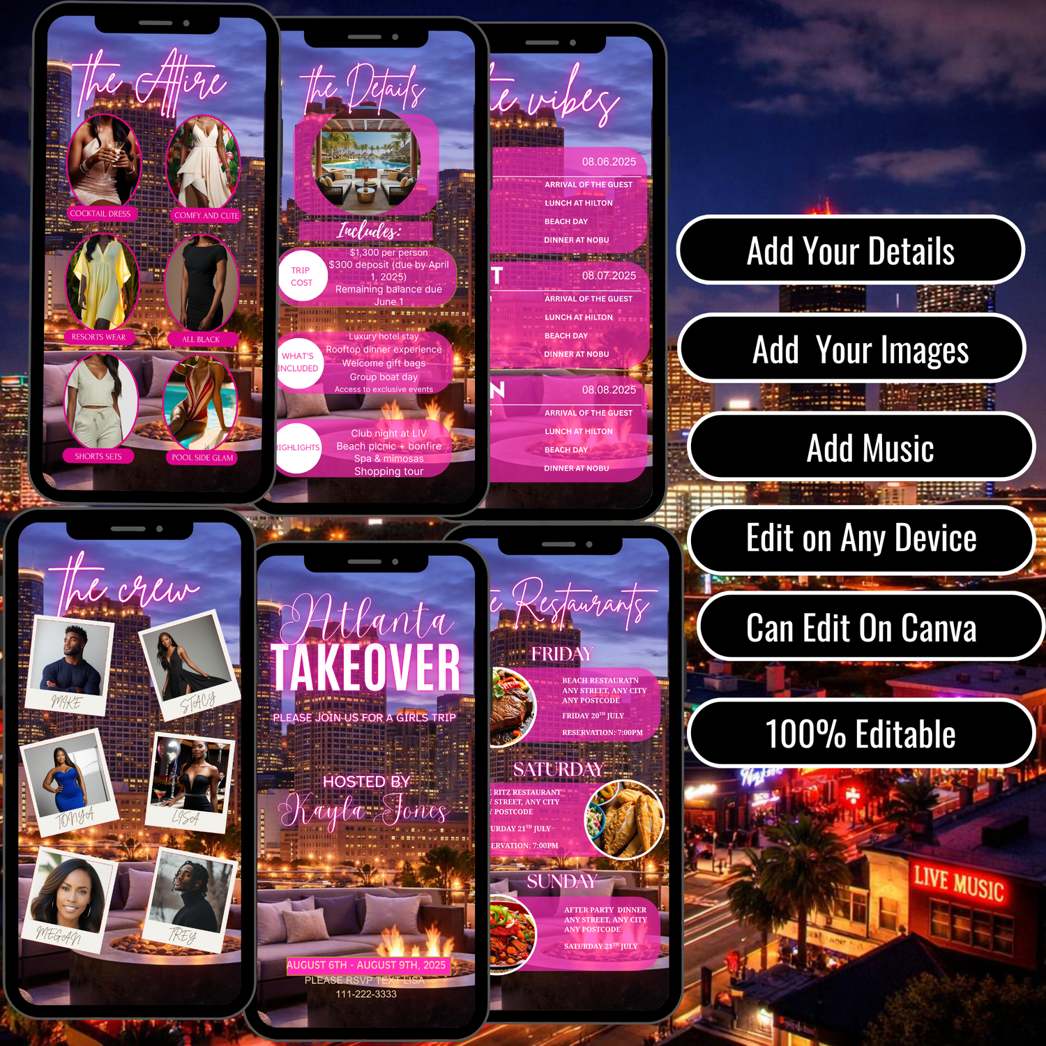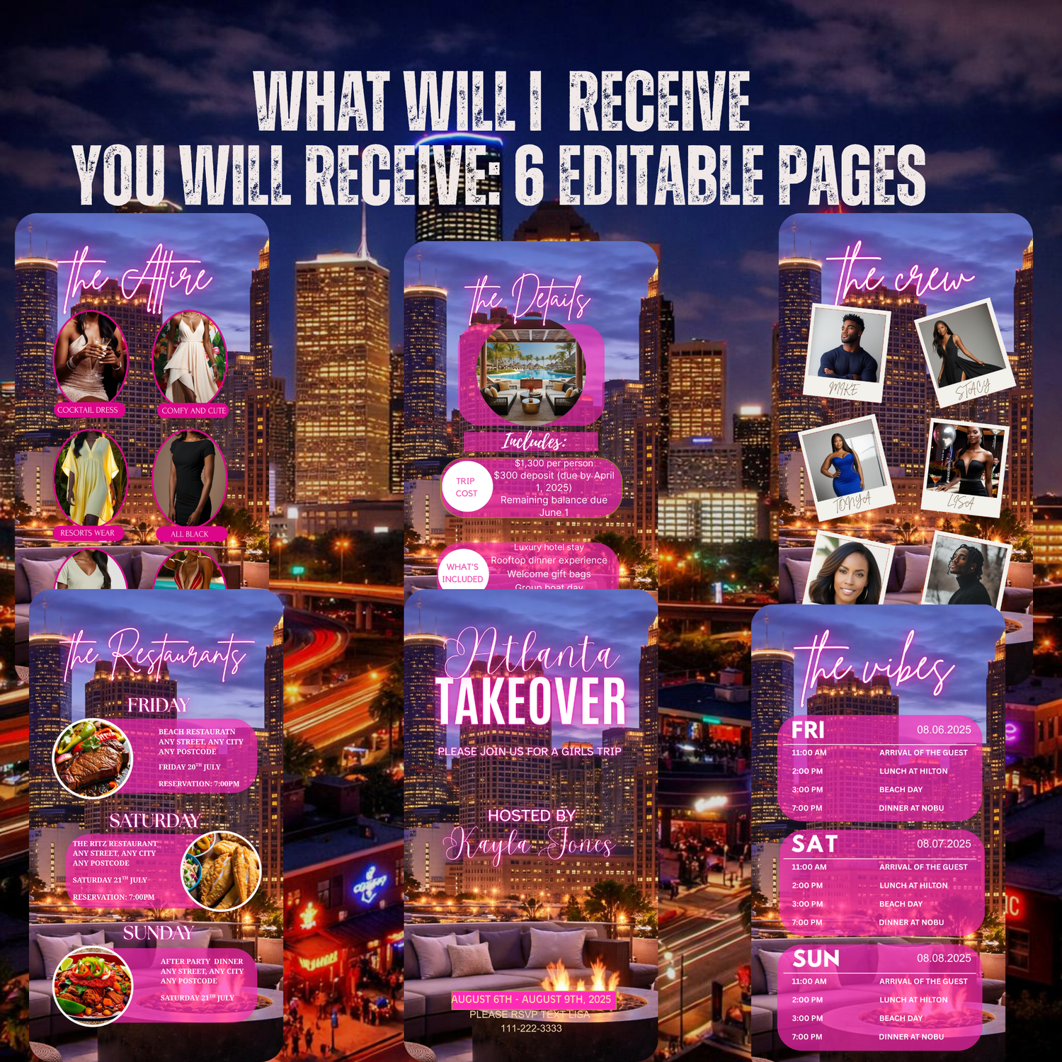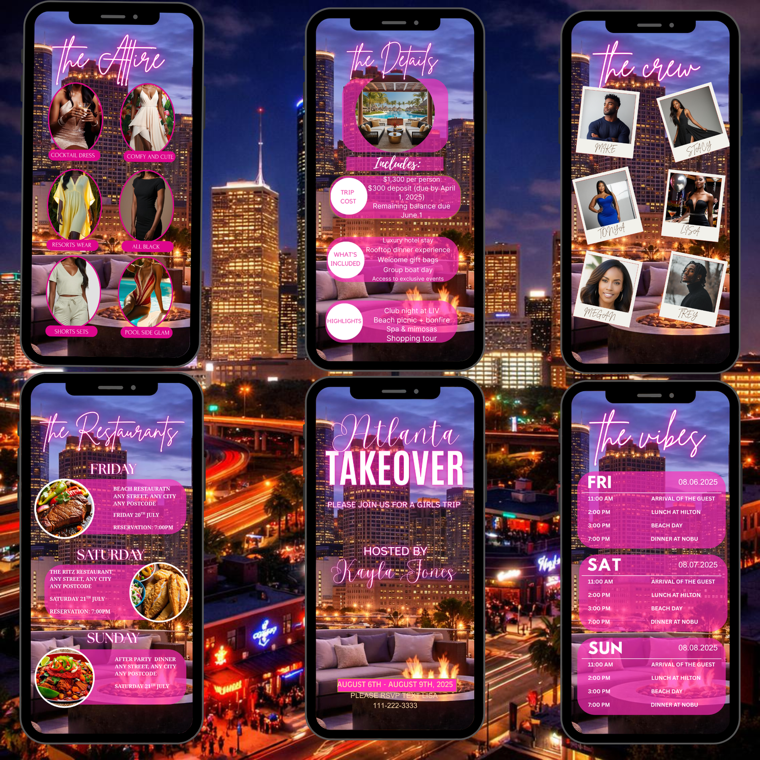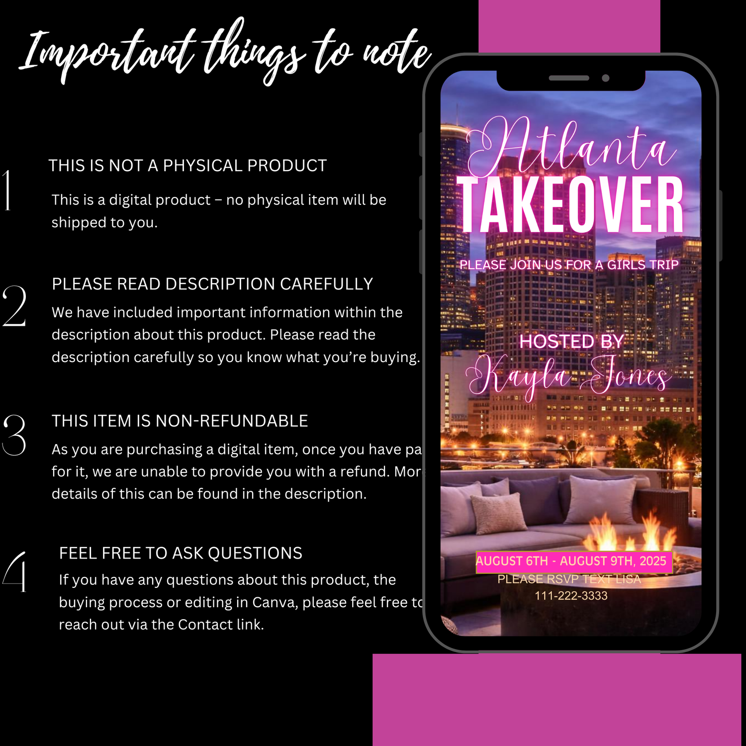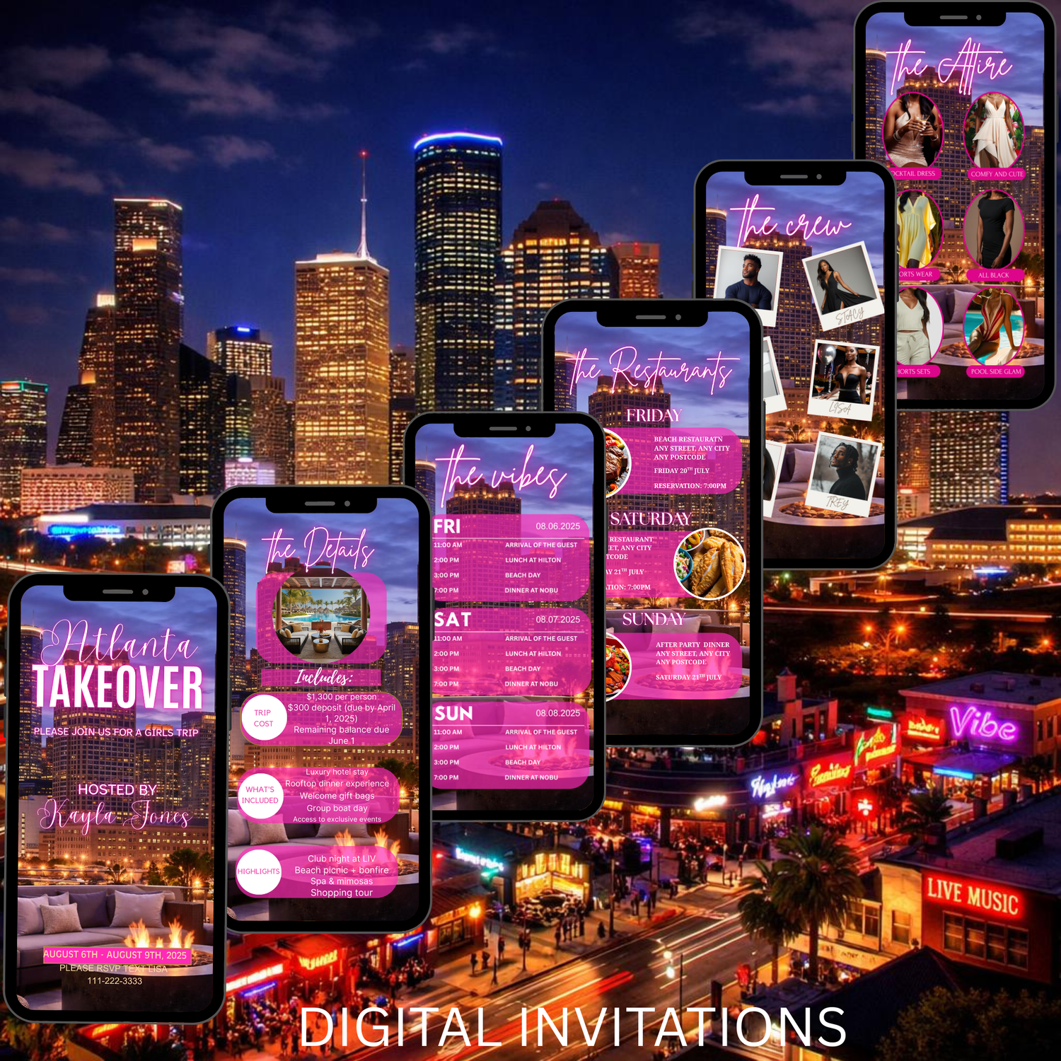 Celebrate your birthday getaway in style with this vibrant Atlanta trip invitation. Eye-catching, this design makes the perfect announcement for a girls' trip, bachelorette adventure, or milestone birthday celebration. The striking color combination and modern aesthetic set the tone for an unforgettable journey. Ideal for creating buzz and excitement among your guests before the trip begins.
