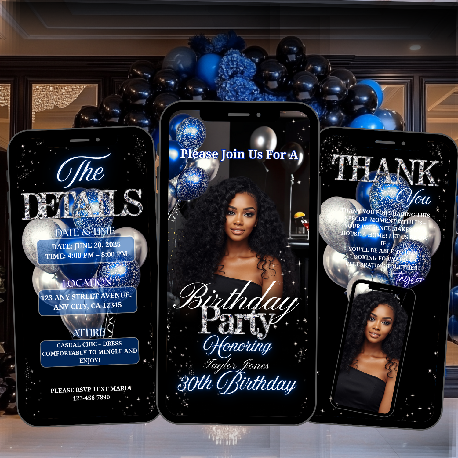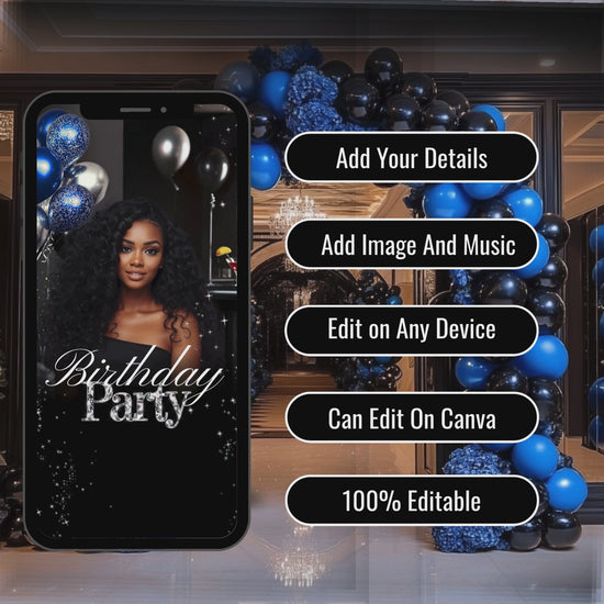 Celebrate in style with this elegant blue and silver birthday party digital invitation. Perfect for creating a sophisticated atmosphere, this customizable design features rich brown tones accented with luxurious gold details. The invitation includes dedicated sections for RSVP information and event details, making it easy for guests to respond and stay informed. Ideal for milestone birthdays, adult celebrations, or upscale gatherings, this digital file arrives instantly for immediate use. Simply personalize with your event specifics and share via email or messaging platforms. No printing required—just download, customize, and send to create a memorable first impression for your special day.