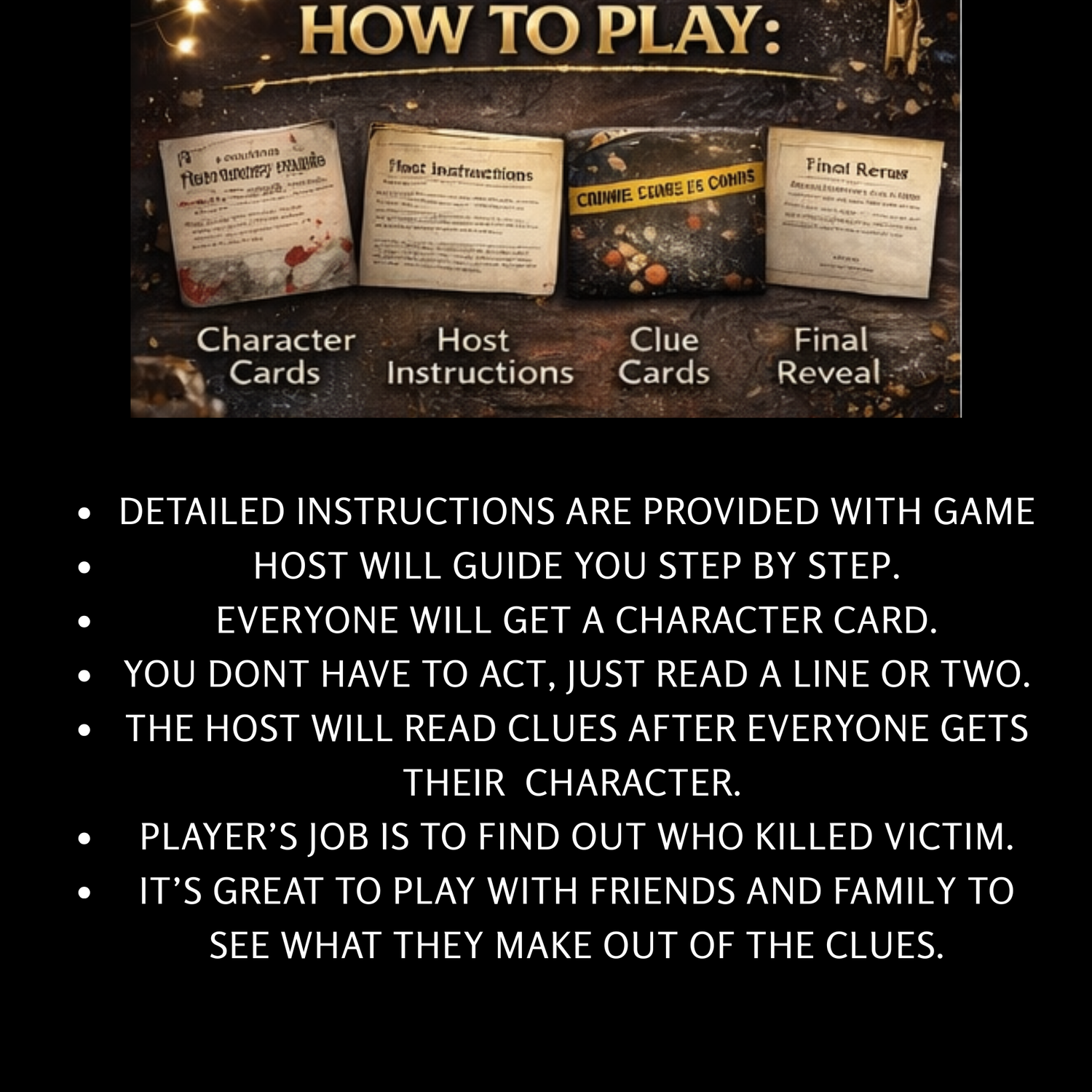Tonight, there are no innocent bystanders. Everyone is a suspect, and everyone is a detective. Trust no one—not even the person standing next to you. Can you unravel the web of lies, sift through the alibis, and identify the killer before they strike again? Or will you be the next victim of their deadly game?". A must-have for hosts who want simple, engaging, and festive entertainment this Christmas season. Perfect for last-minute planning and instant holiday fun!