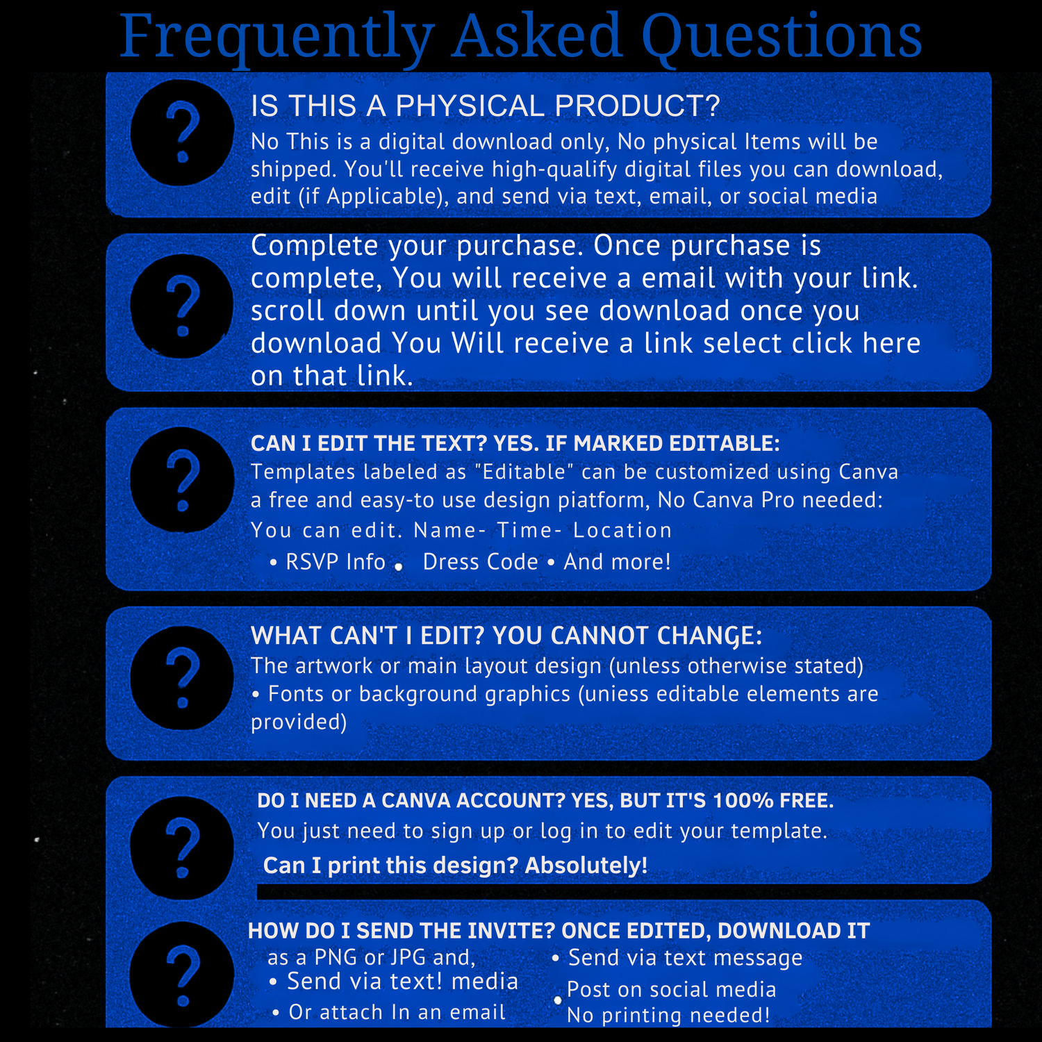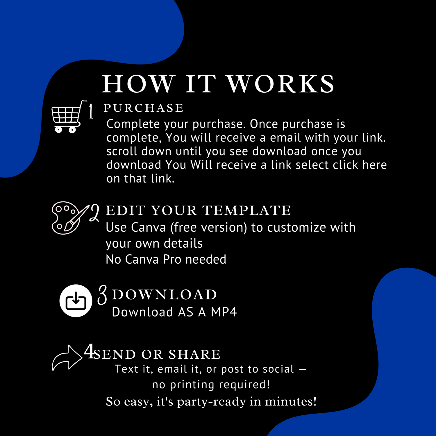 You will receive a Canva template that you can edit yourself using a FREE Canva account. Which you will then downlaod and send to guest.