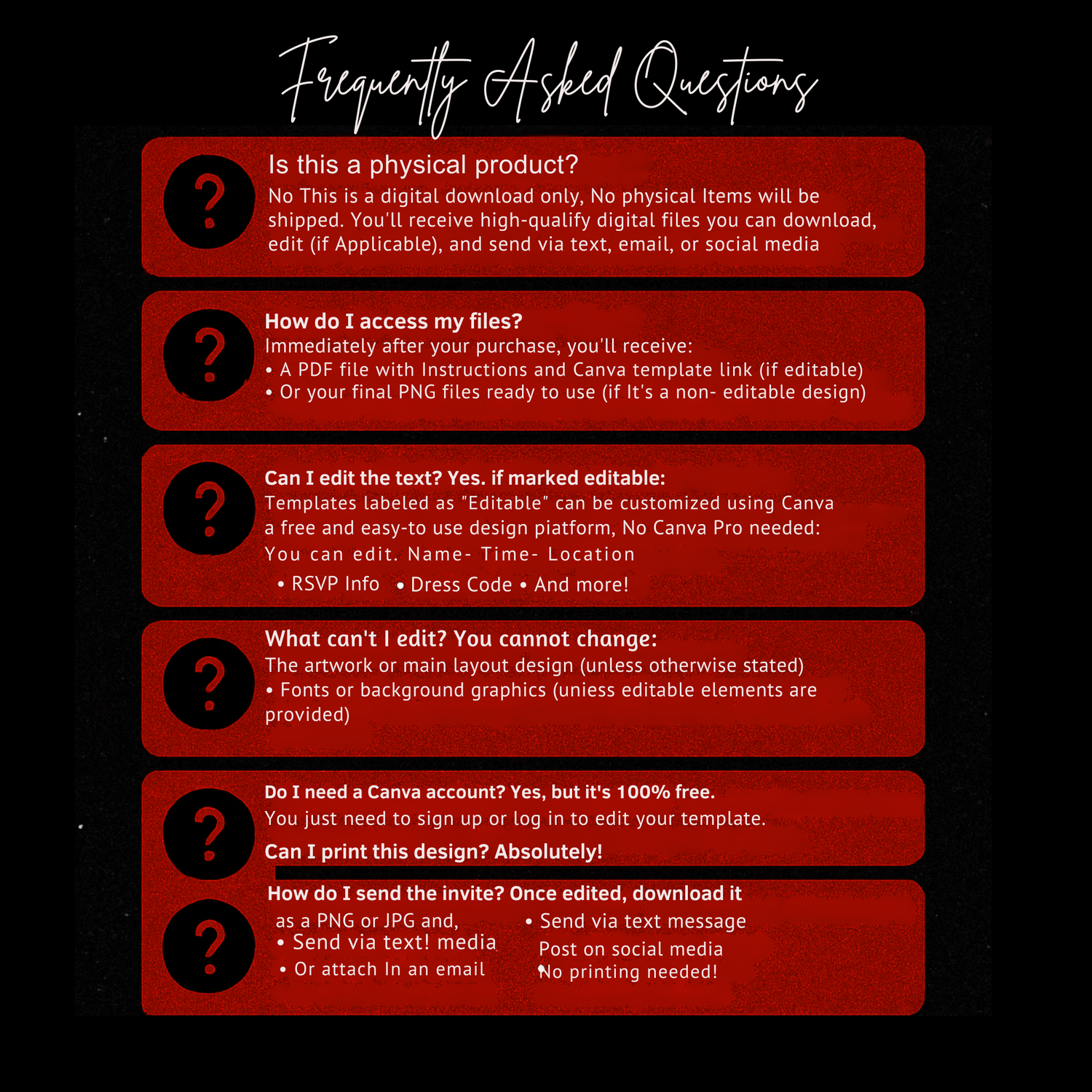 You will receive a Canva template that you can edit yourself using a FREE Canva account. Which you will then downlaod and send to guest.