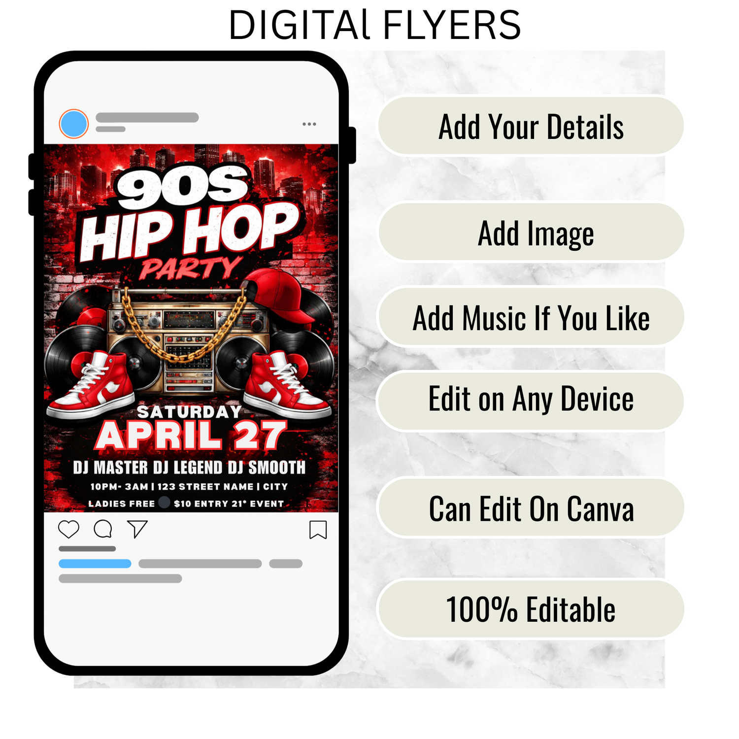 Elevate your event planning with this authentic 90s hip-hop party invitation template. Designed with nostalgic aesthetics and bold typography, this template captures the essence of classic hip-hop culture. Perfect for themed celebrations, birthday bashes, or music-inspired gatherings, it features customizable text fields to personalize your event details. Simply download, edit, and share—ideal for digital or print distribution. Make your guests feel the vibe before they even arrive.