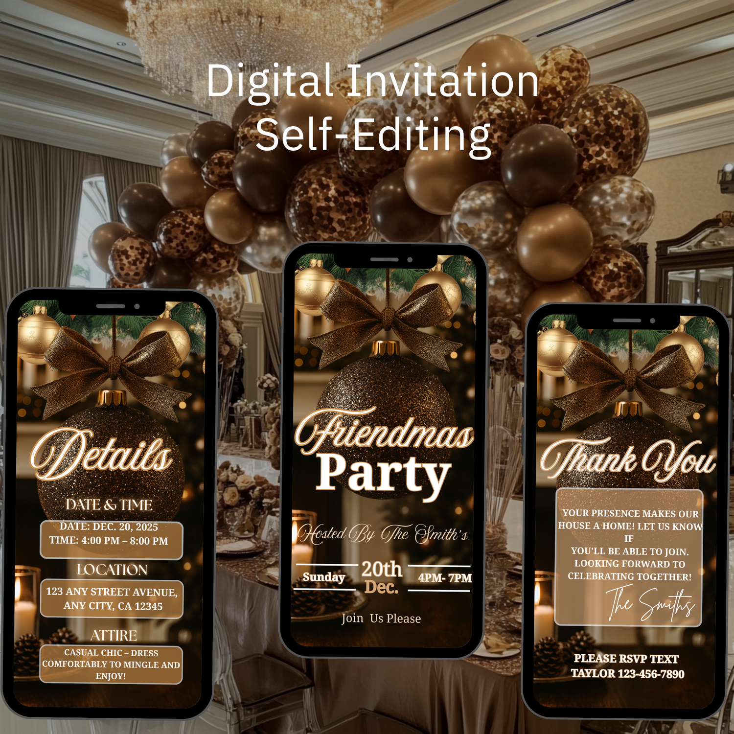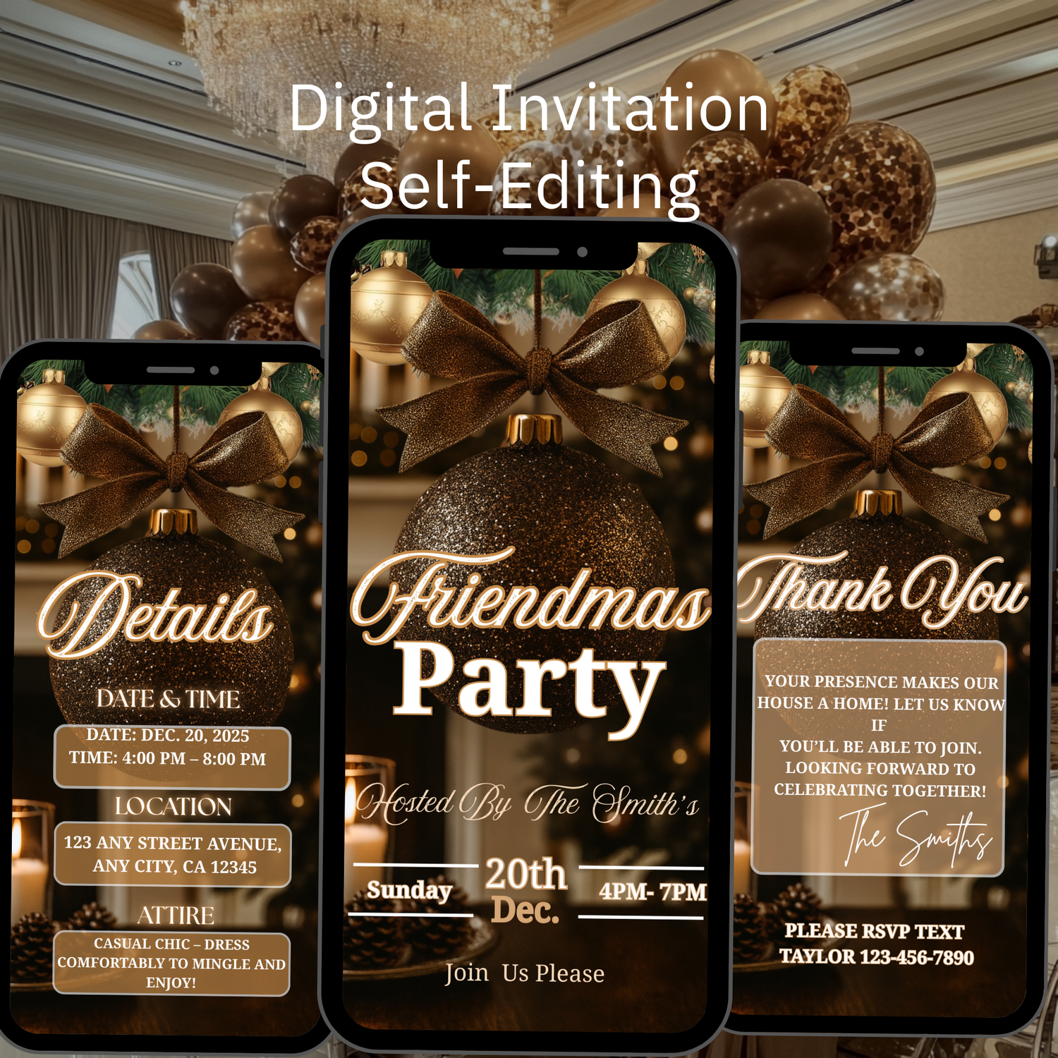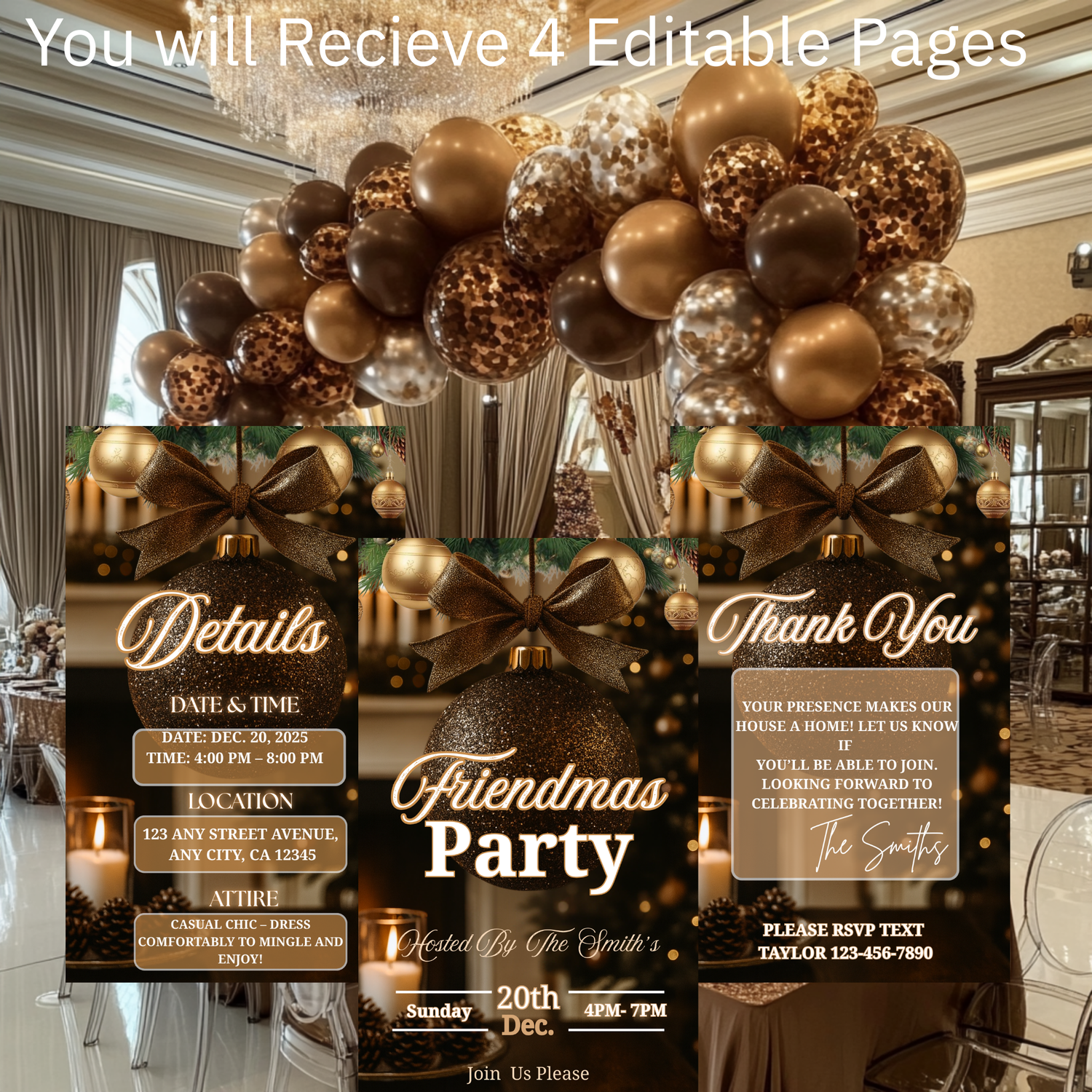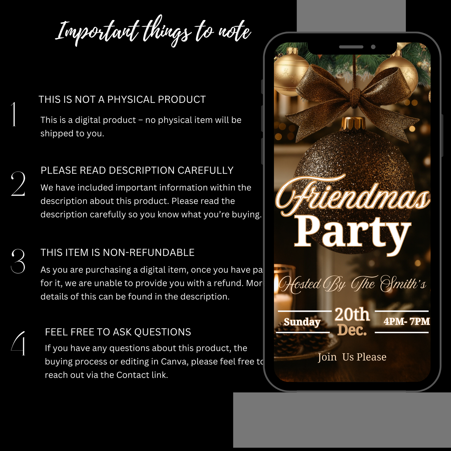 Elevate your holiday gathering with our professionally designed Friendmas Christmas Invitation. This expertly crafted template combines festive graphics with elegant typography to create an invitation that captures the spirit of seasonal celebration. Fully customizable to reflect your event's personality, it allows you to seamlessly add your party details, date, and venue information. Ideal for friend groups looking to coordinate a memorable holiday get-together, this invitation design ensures your guests receive a polished, thoughtfully presented announcement that builds anticipation for your festive event. THIS IS 100% EDITABLE CHANGE IT TO SAY WHAT YOU WANT ADD YOUR OWN IMAGES IF YOU LIKE. LITERALLY TAKE 5 MINUTES TO DO